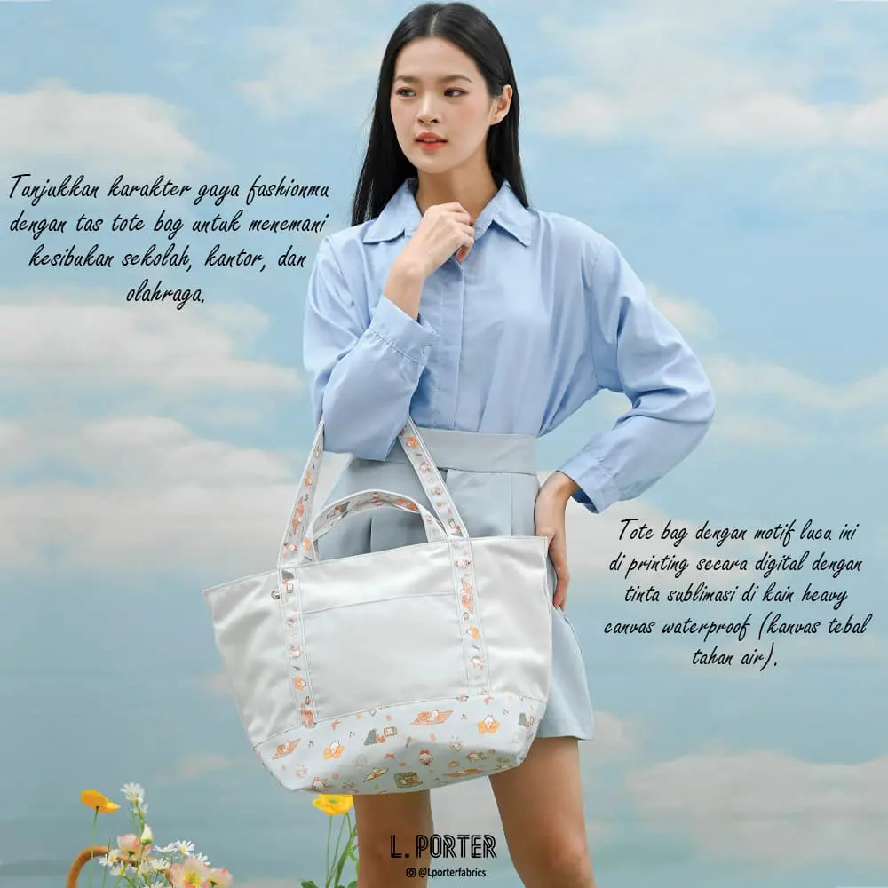 - Gaya Kasual: Gunakan tas totebag bahan canvas atau waterproof dengan motif digital printing yang unik. Padukan dengan bawahan bahan denim dan kaos polos untuk tampilan santai yang tetap stylish.